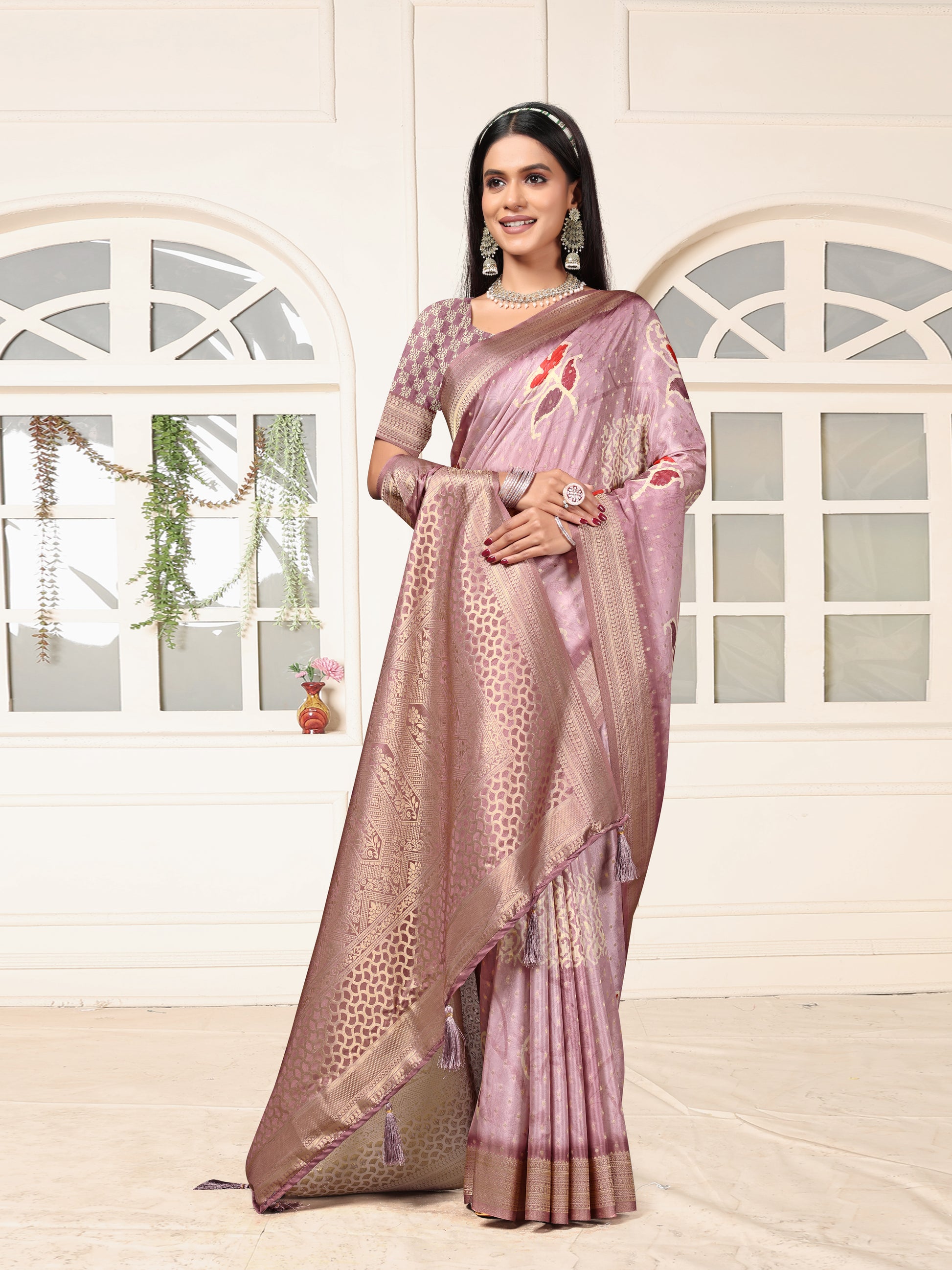 Drape yourself in elegance with this lavender silk saree adorned with intricate zari weaving and floral designs. Ideal for weddings, festive occasions, and parties, this saree blends tradition with modern charm.