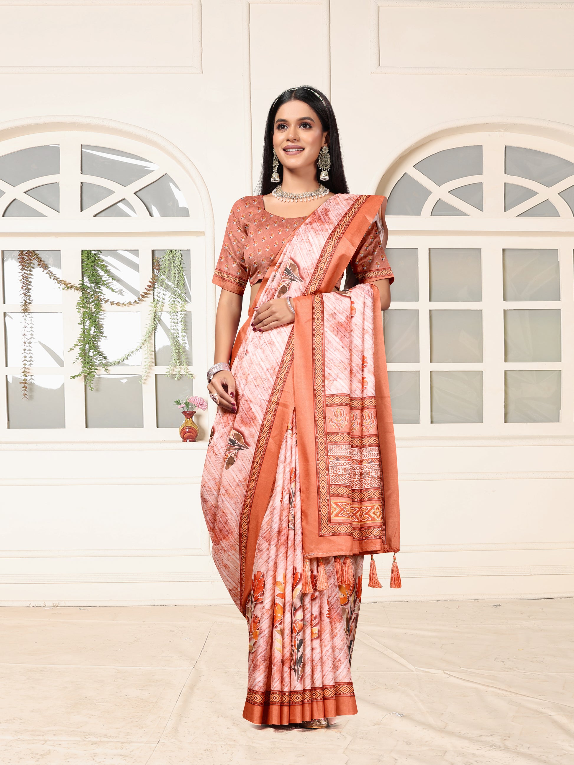 Step into timeless elegance with this peach floral printed saree featuring a beautifully designed border. Perfect for weddings, parties, and festive occasions, this lightweight saree blends comfort with style effortlessly.