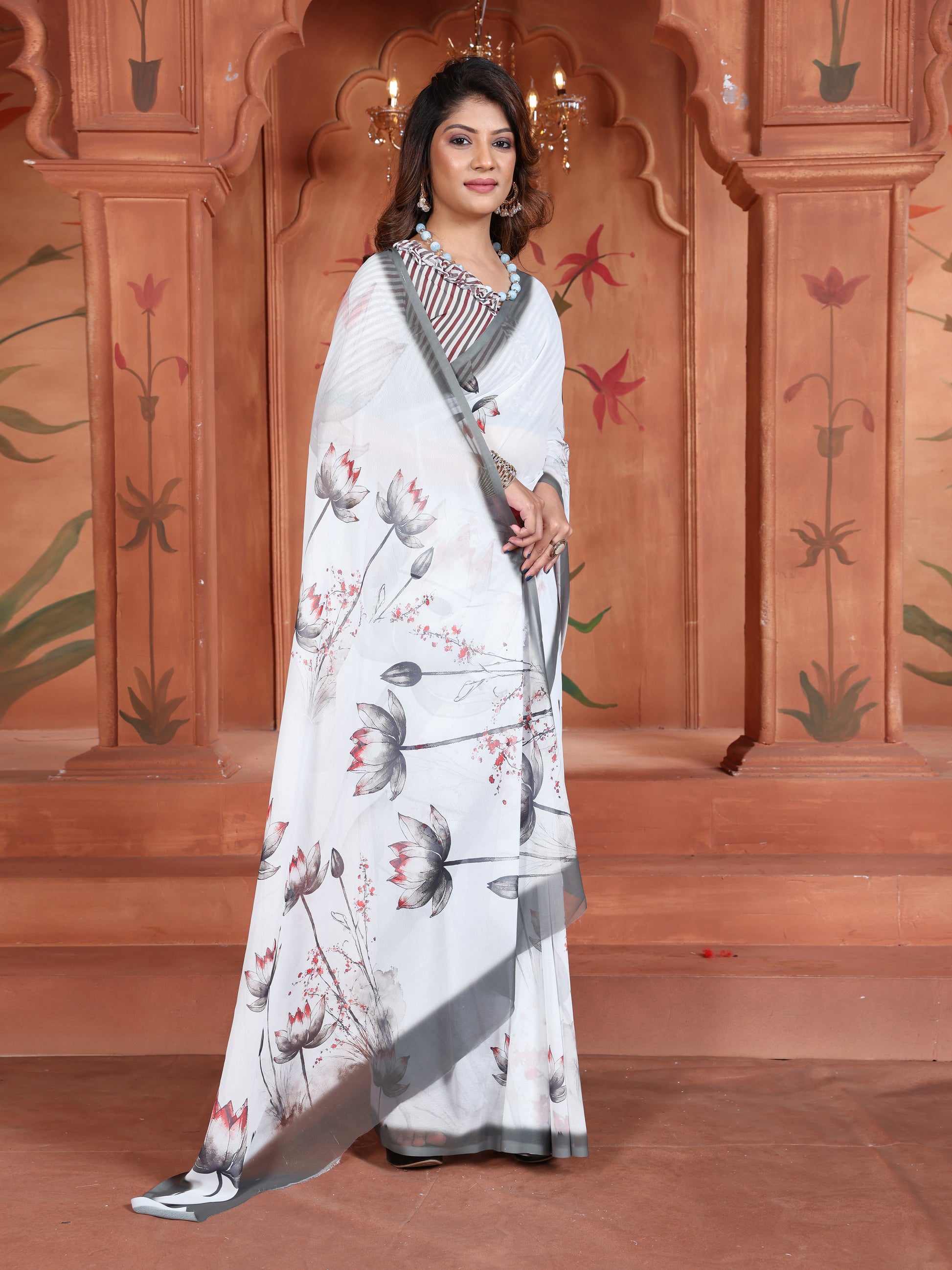Refresh your wardrobe with this elegant white saree featuring artistic floral prints and a chic gray border. Made from soft, comfortable fabric, it’s perfect for festive parties or formal gatherings. Pair with statement jewelry for a complete, stylish look.