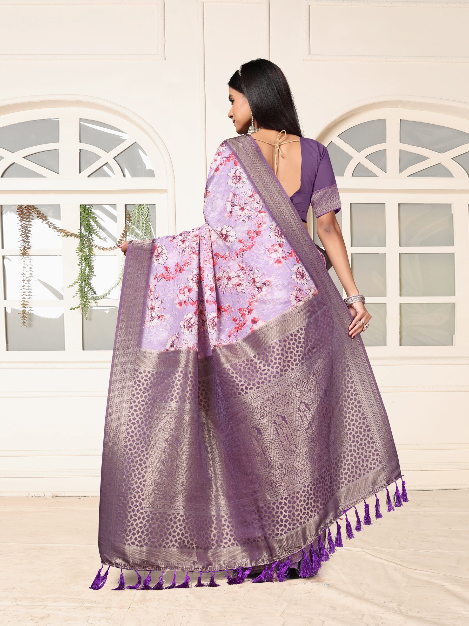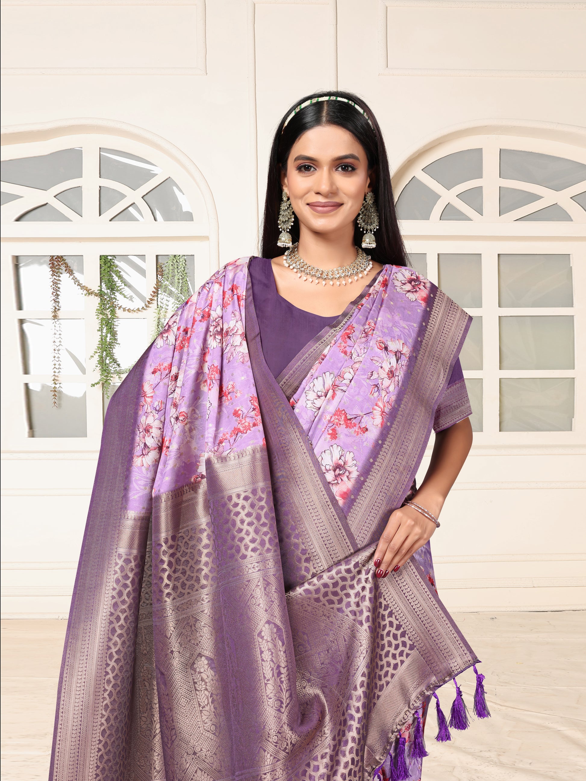 Elevate your ethnic look with this lavender floral printed saree featuring a rich woven border and elegant drape. Ideal for festive celebrations, parties, and wedding functions, this saree blends sophistication with modern charm.